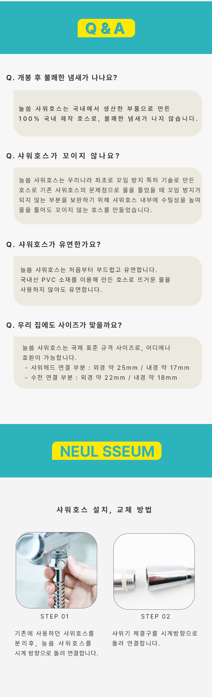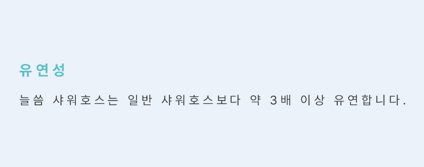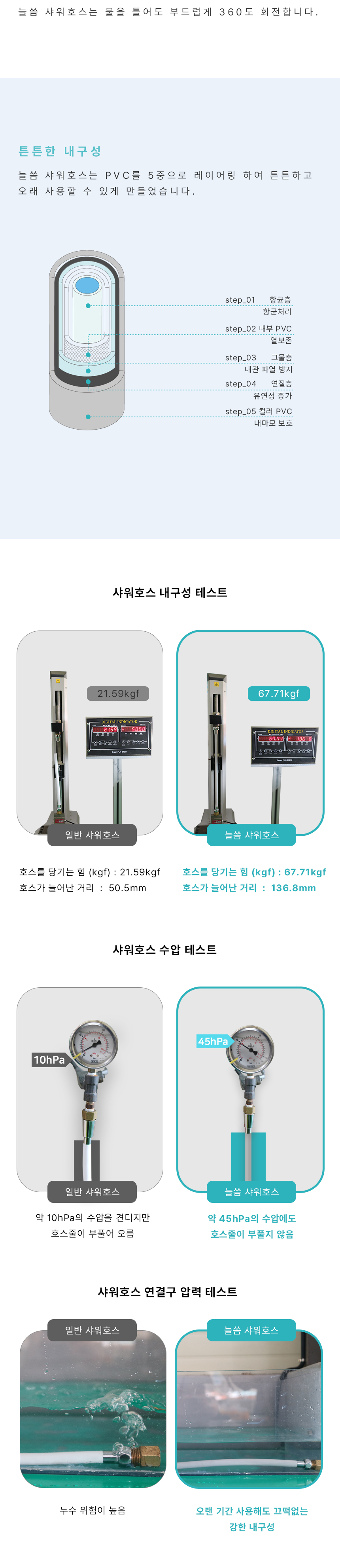 매끄러운 표면 세균 번식 방지,  국내 최초 꼬임방지 특허. 유해물질 및 환경호르몬 불검출, 유연한 샤워호스 강력한 내구성